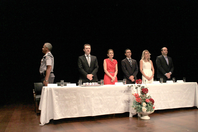 Na mesa: Representante da PM de Orlândia Capitão Carlos Alberto Matiuzzo, Promotor de Justiça Ramon Lopes Neto, Juiza Eleitora Dra. Ana Luiza Fontes, Presidente da Câmara de Orlândia José Inácio, Dra. Juiza de Direito Ana Carolina Aleixo e o Presidente da OAB Orlândia Luciano José Ribeiro.