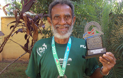 Foto: Osvaldão exibe orgulhoso a medalha e o troféu da competição/NOVACIDADE